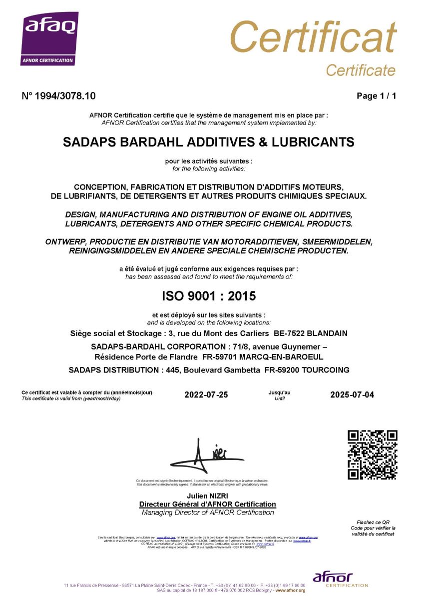 В течение последних 50 лет лаборатории "SADAPS BARDAHL" анализировали и вырабатывали решения в соответствии с меджународным законодательством, принимая во внимание стандарты по защите окружающей среды от загрязнения. Существующие 5 лабораторий гарантируют соответствие изделий мировым стандартам на всех стадиях производства.